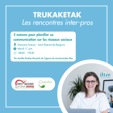 La prochaine rencontre aura lieu le mardi 11juin de 19h00 à 20h30 au Domaine Gutizia, à Baigorry, et sera consacrée à lacommunication sur les réseaux sociaux avec pour sujet : 5 astuces pourplanifier sa communication sur les réseaux sociaux.